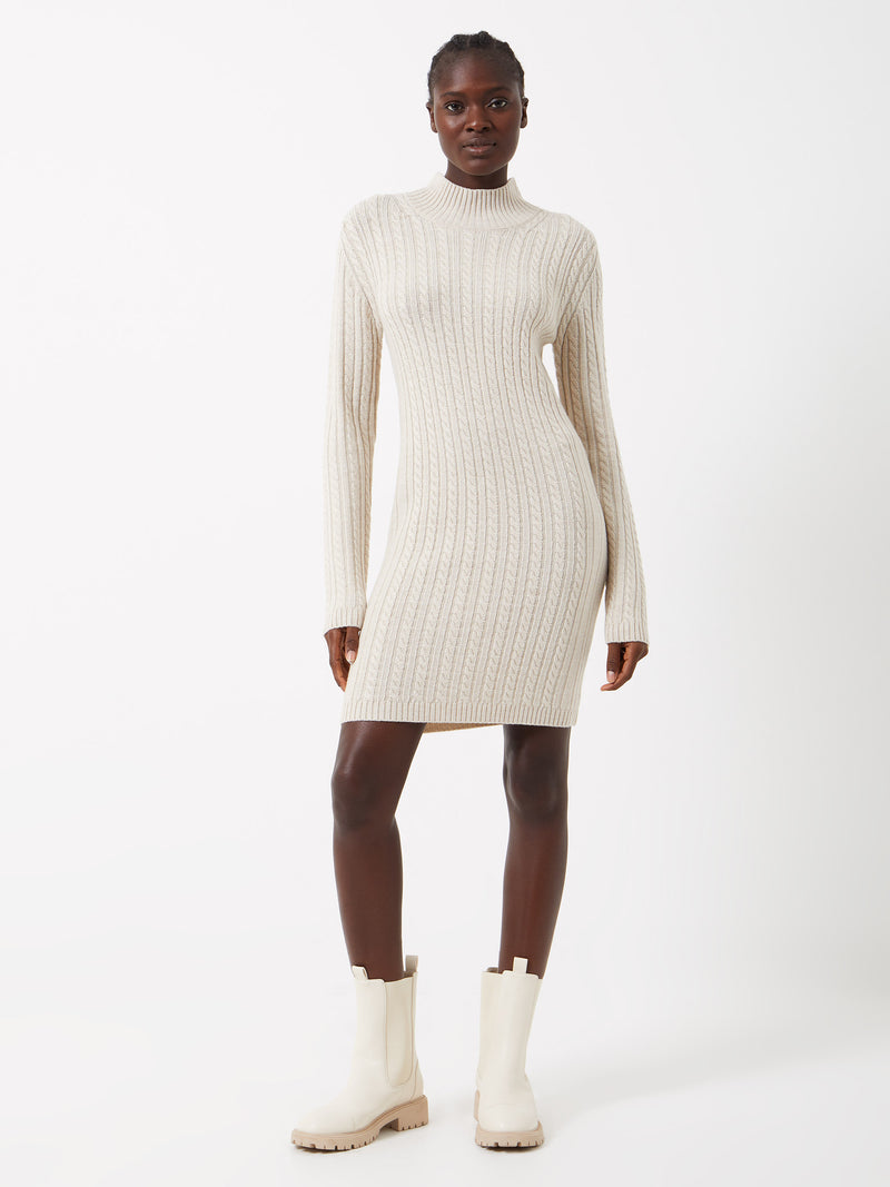 Katrin Cable Knit Long Sleeve Mini Dress Light Oatmeal Mel French Connection Uk
